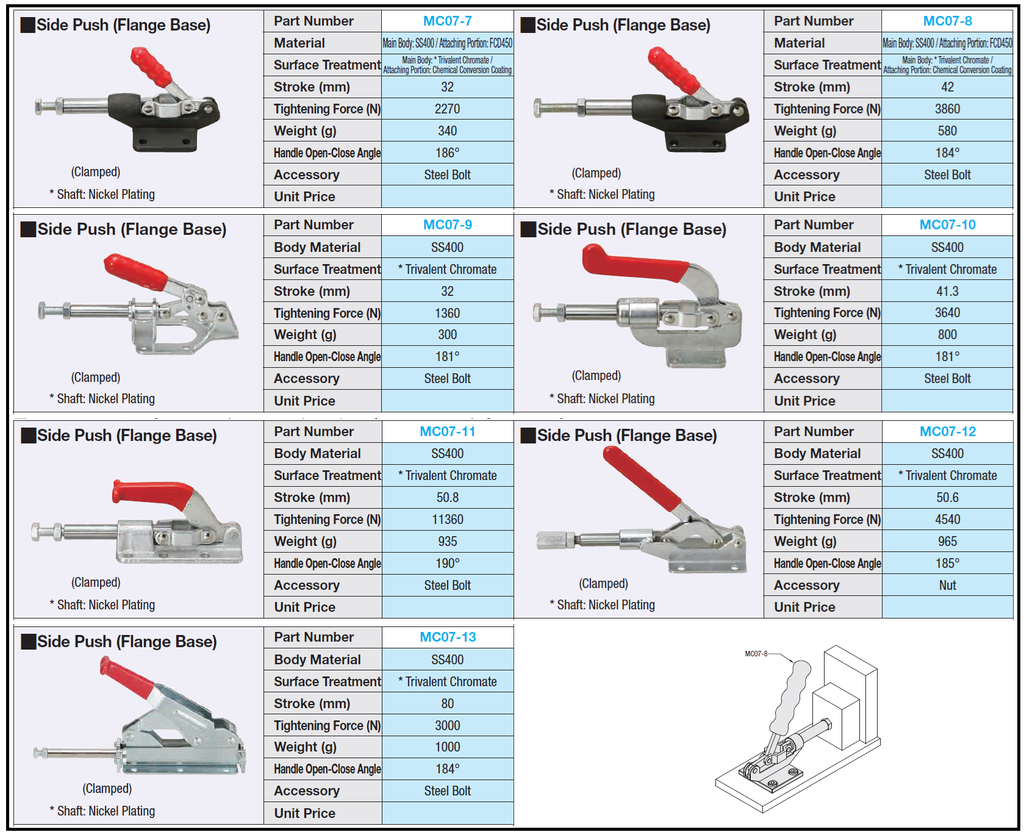 MC07 không phải là một sản phẩm đơn lẻ mà là một series với nhiều dải kích cỡ, lực kẹp (Clamping Force) và hành trình đẩy khác nhau: