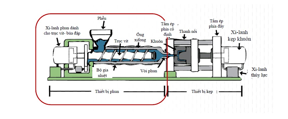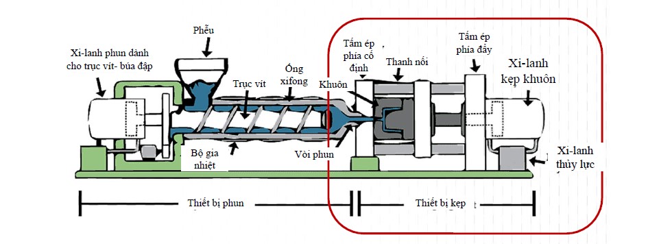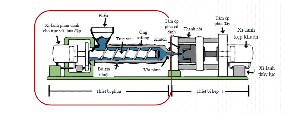 "Phễu,Trục vít,Ống,xifong Khuôn,Bộ gia Vòi phun,nhiệt,Thiết bị phun Thiết bị kẹp,Tấm ép,phía đẩy,Xi-lanh,kẹp khuôn,Tấm ép phía cố định, Thanh nối,Xi-lanh thủy lực,Xi-lanh phun dành cho trục vít- búa đập"