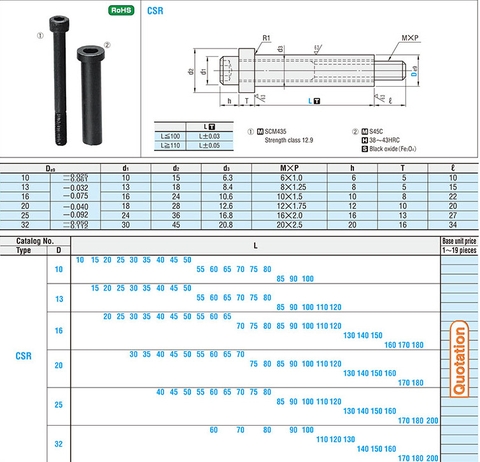 Ống lót bu lông dẫn hướng CSR16 là một bộ phận quan trọng trong các máy dập khuôn. Nó có nhiệm vụ giữ bu lông dẫn hướng cố định trong quá trình dập khuôn, giúp cho quá trình dập khuôn diễn ra chính xác và hiệu quả hơn.